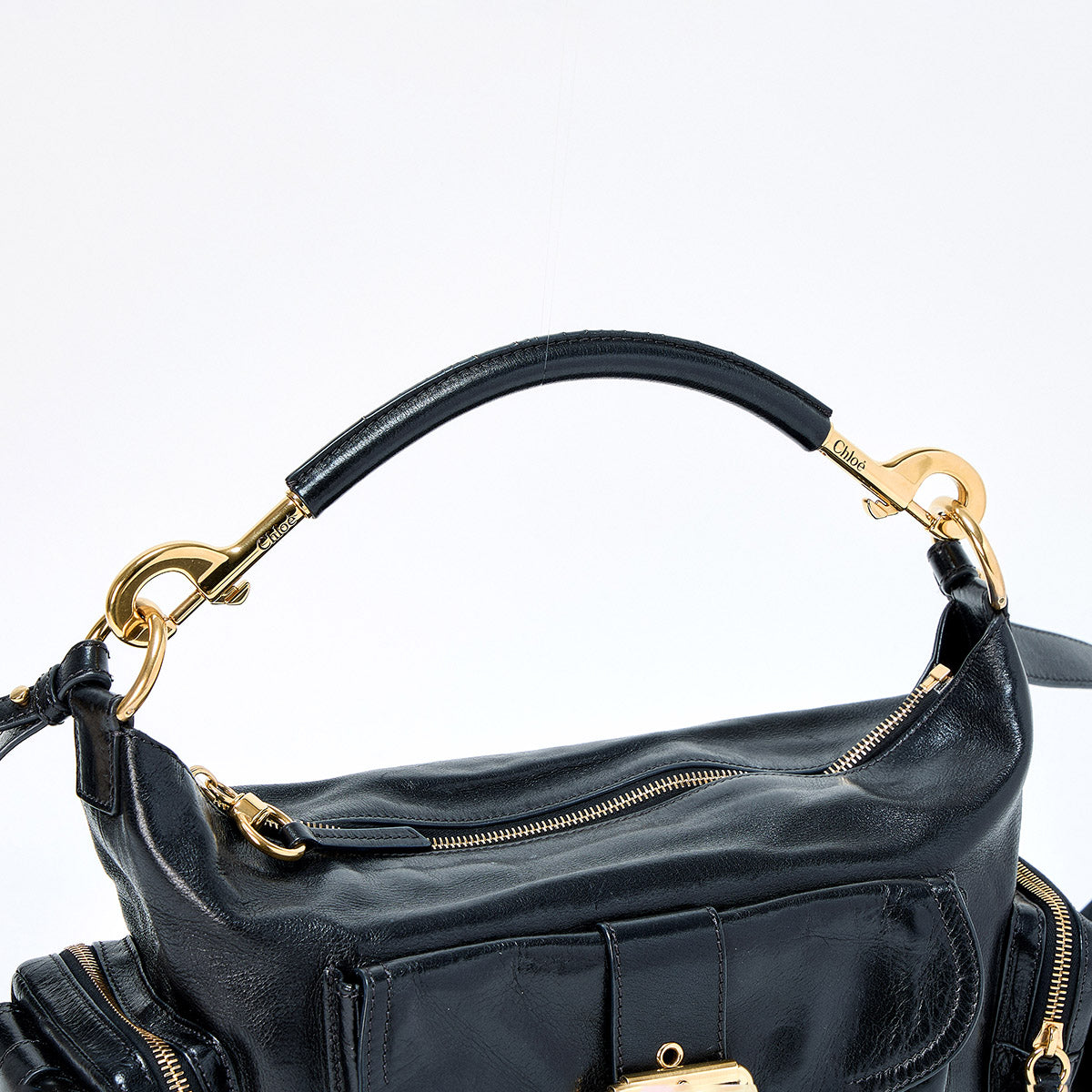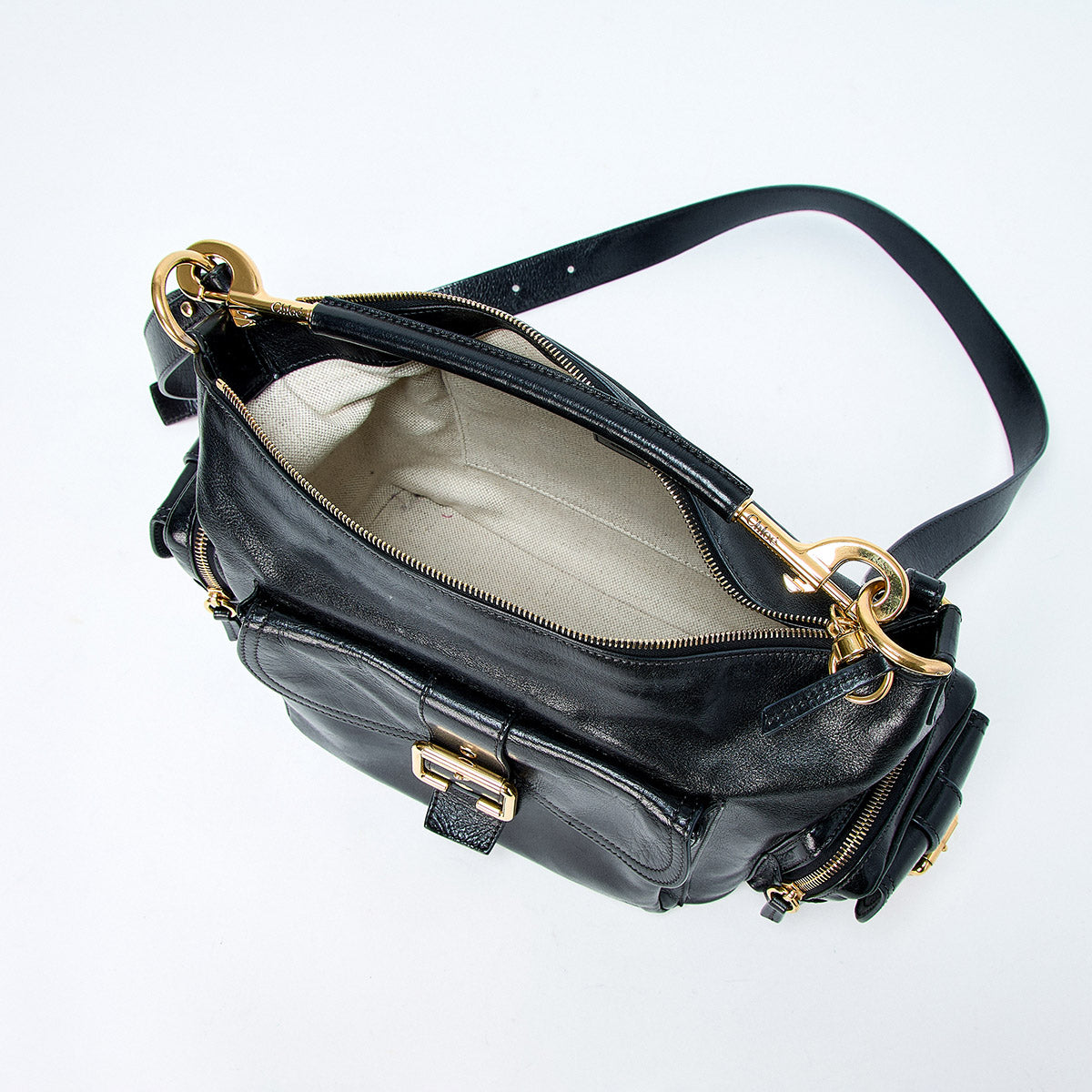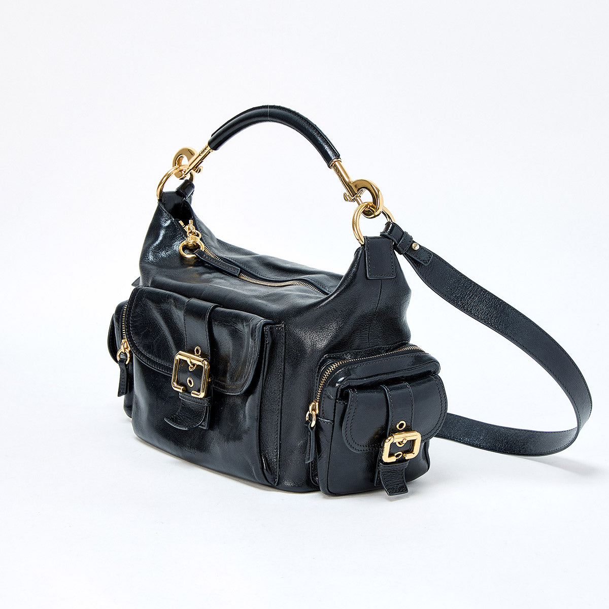 Chloe Camera Bag Hand Bag Black Gold Shiny Leather Auth