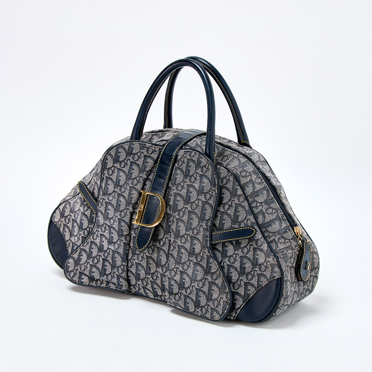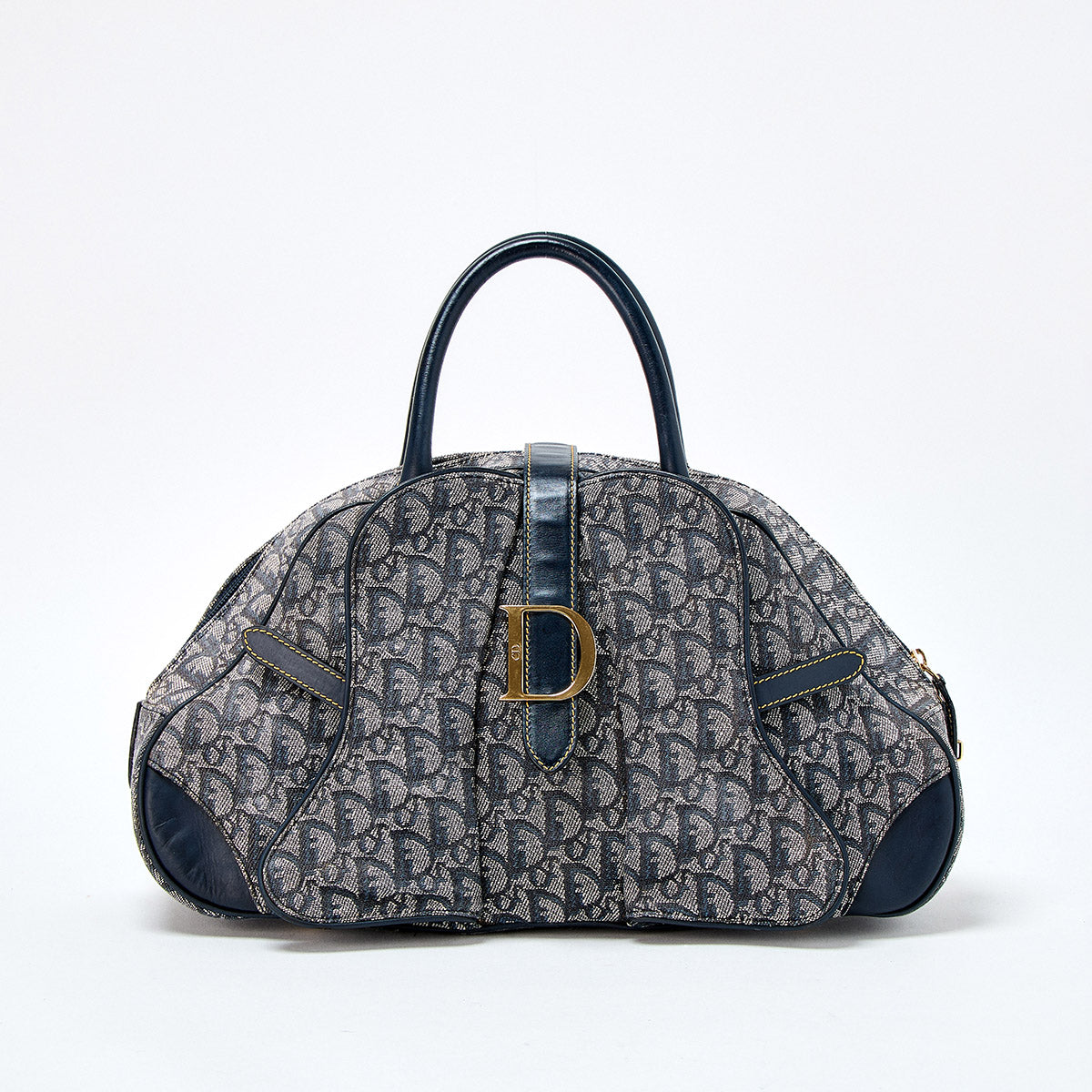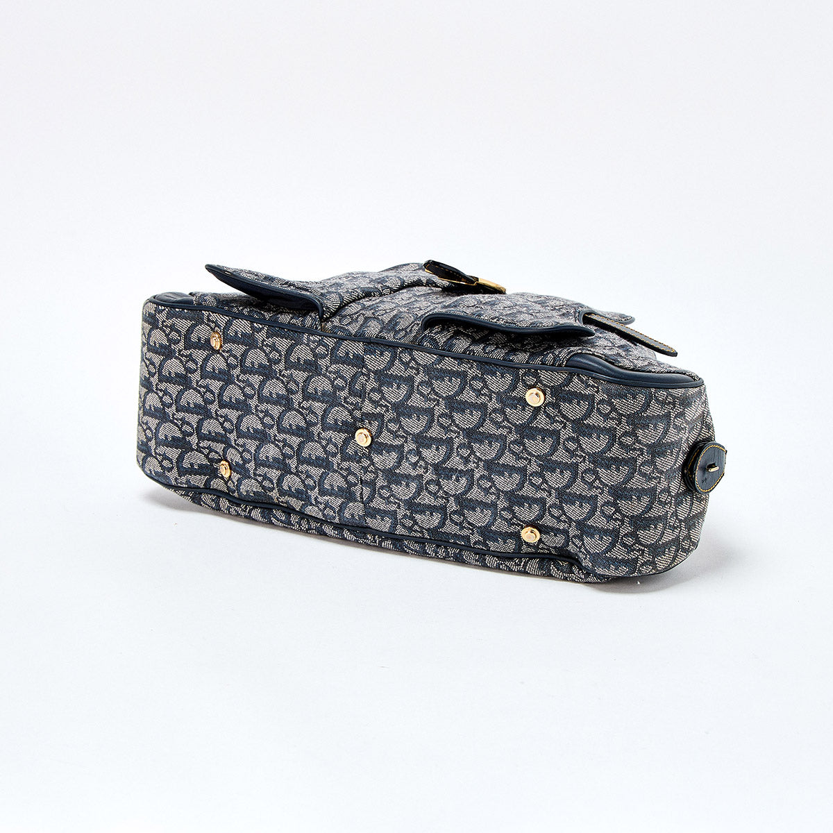 Christian Dior Double Saddle Hand Bag Navy Gold Canvas Auth