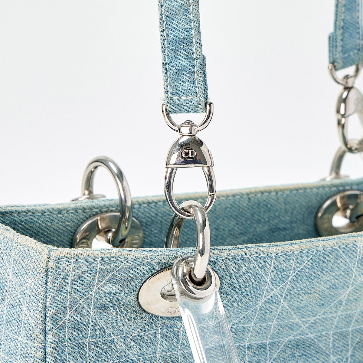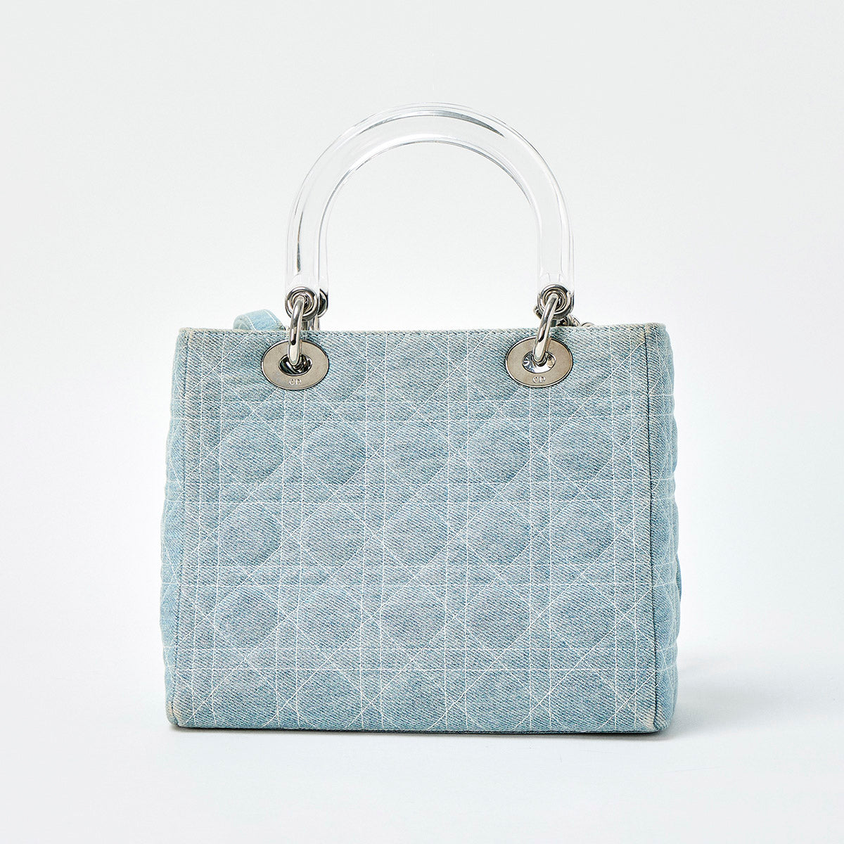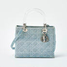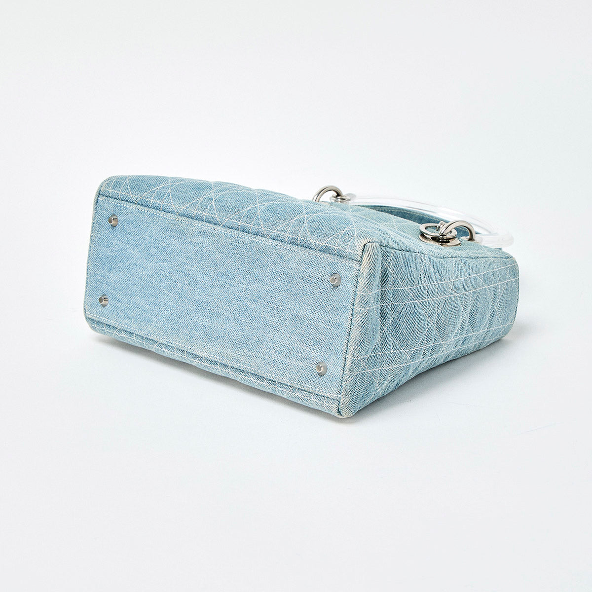 Christian Dior Lady Dior Medium Hand Bag Light Blue Silver Denim Plastic Auth