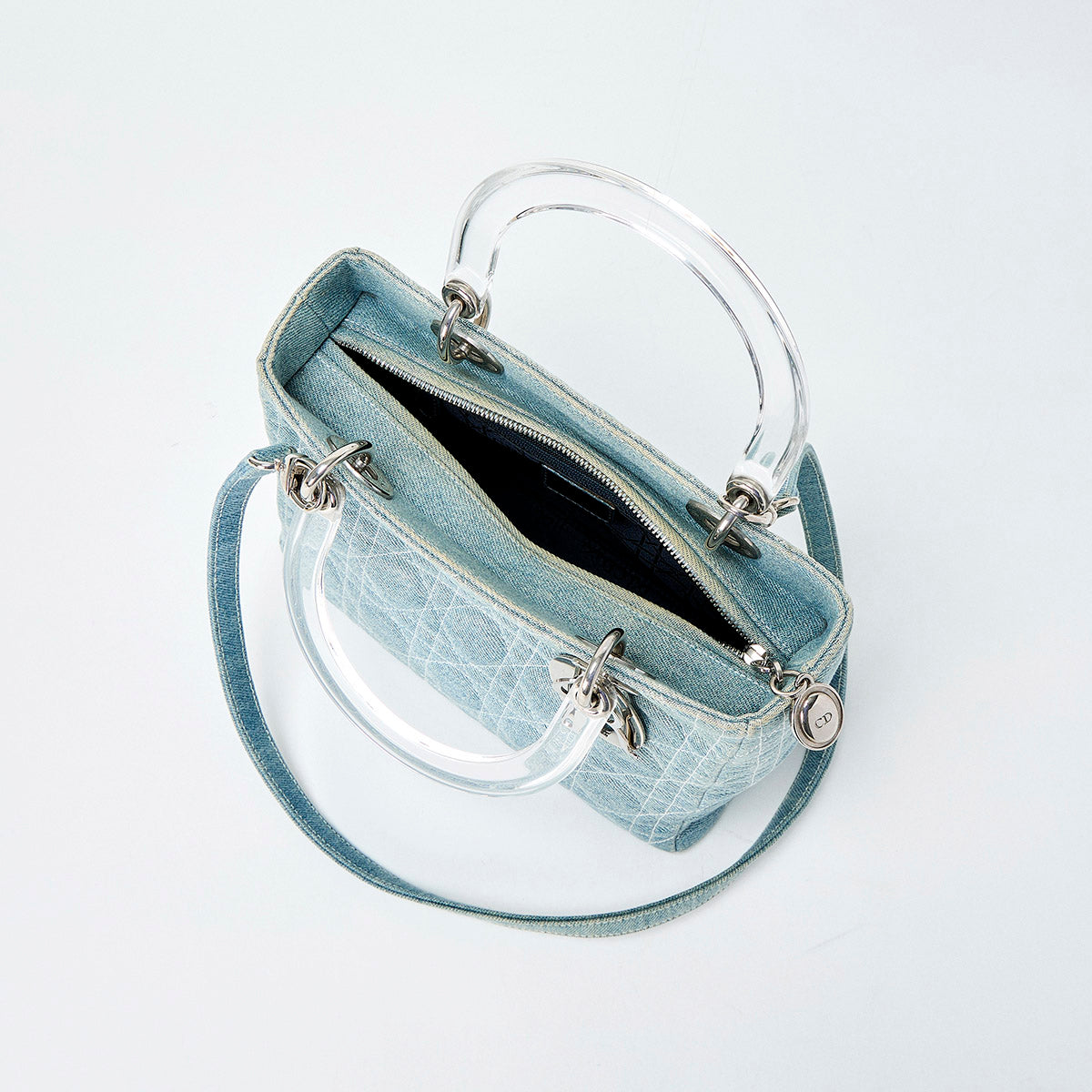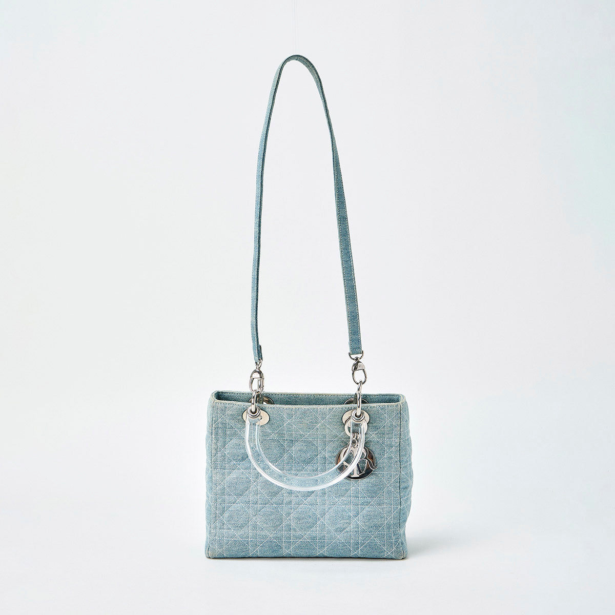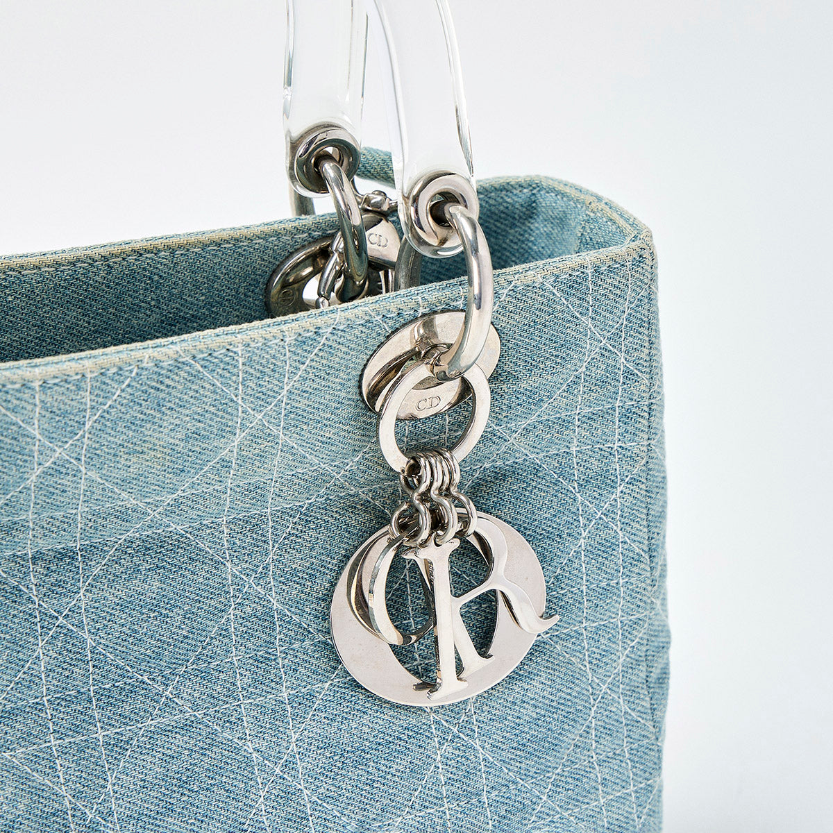 Christian Dior Lady Dior Medium Hand Bag Light Blue Silver Denim Plastic Auth