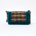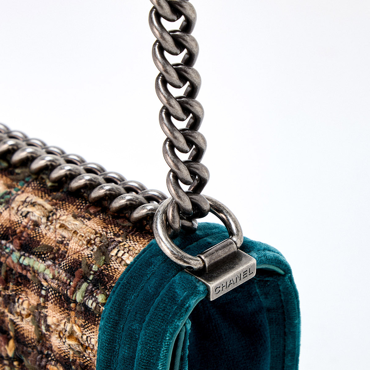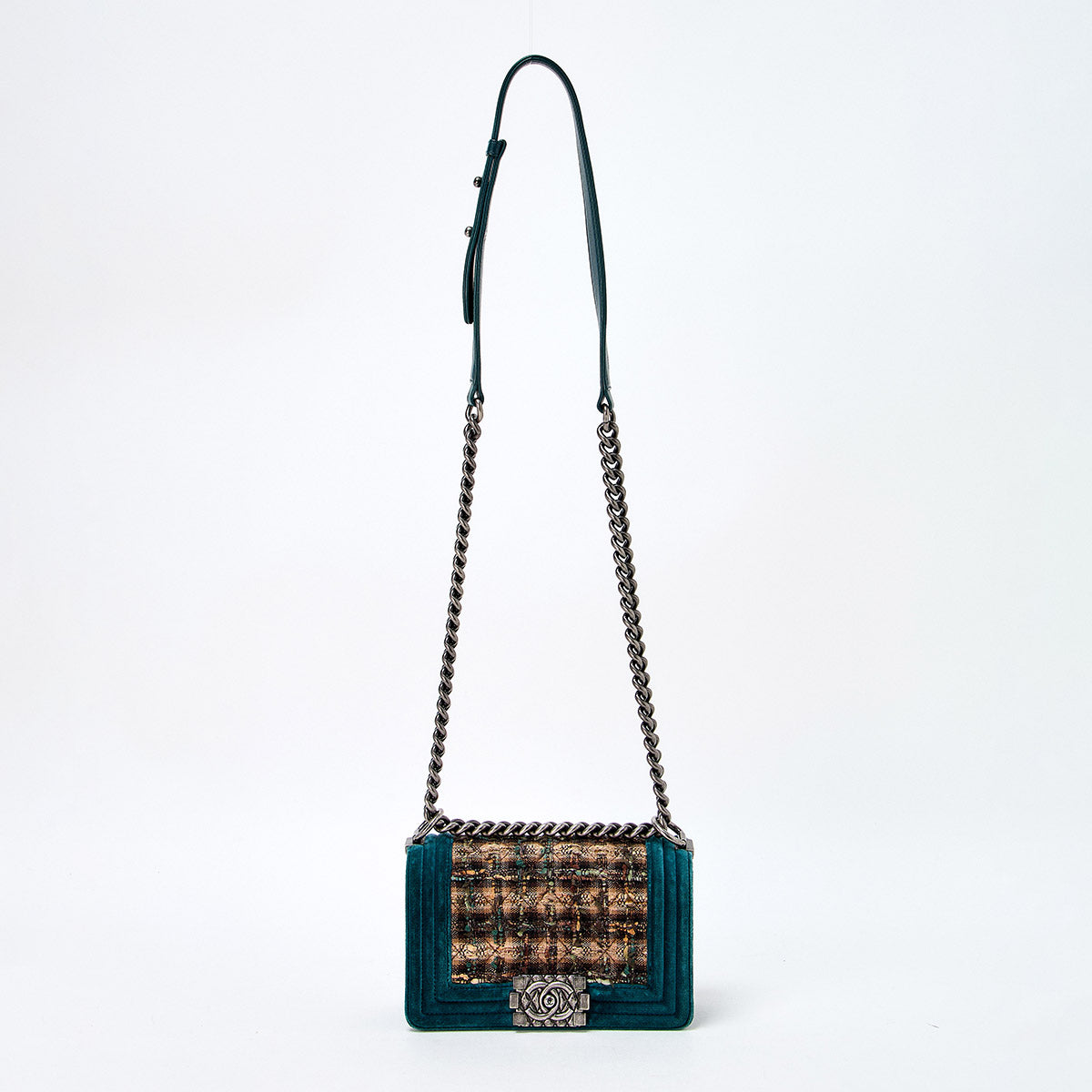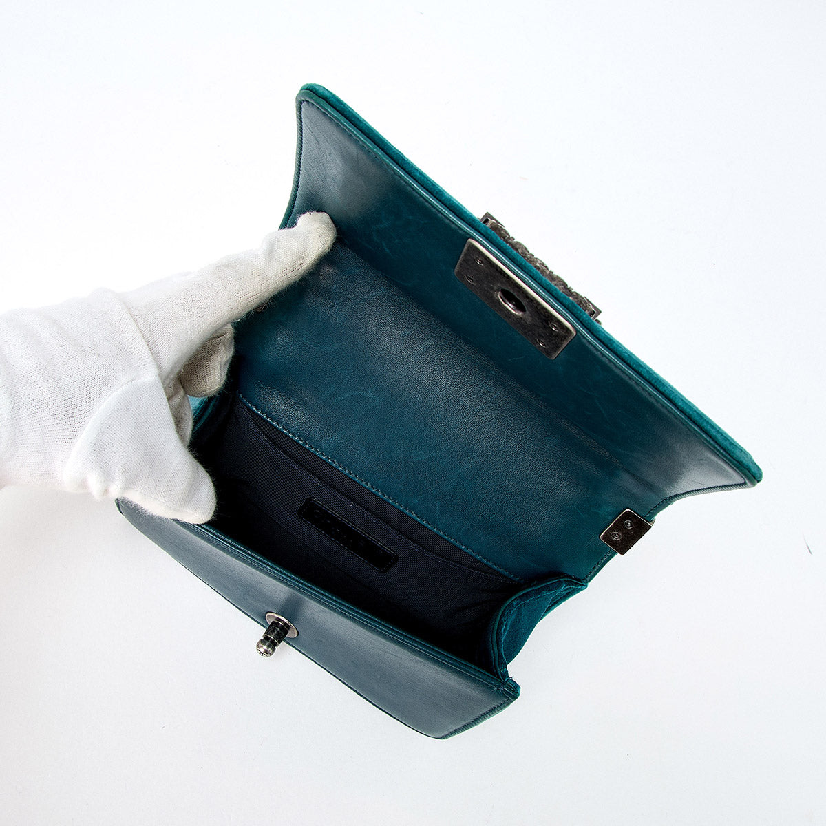 CHANEL Boy Chanel Single Flap Double Chain Small 2014 Shoulder Bag Green Brown Silver Velour Auth