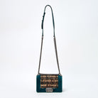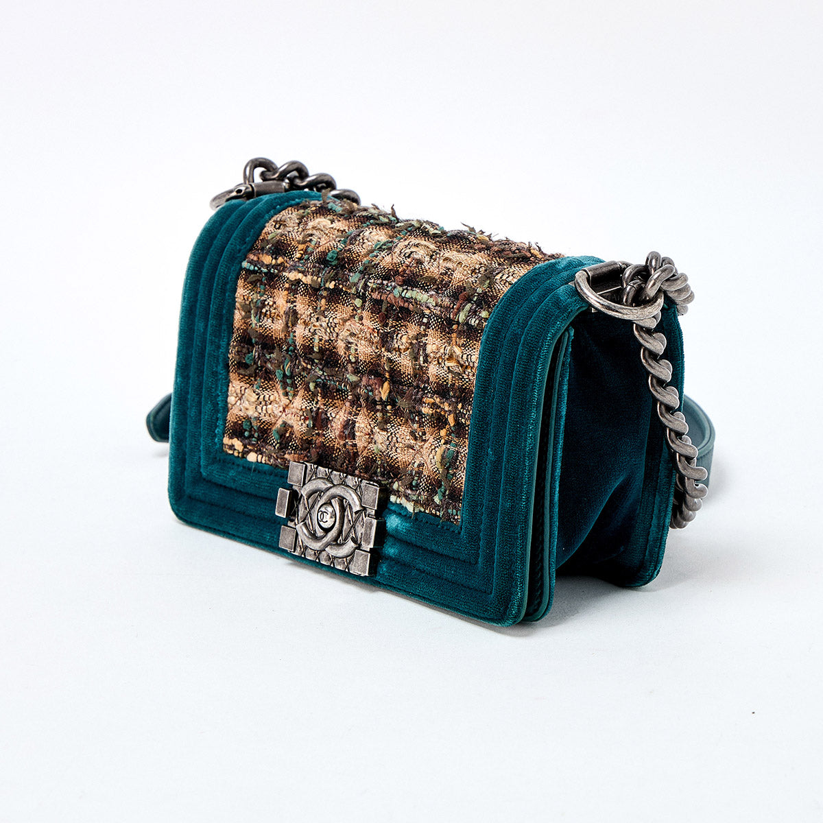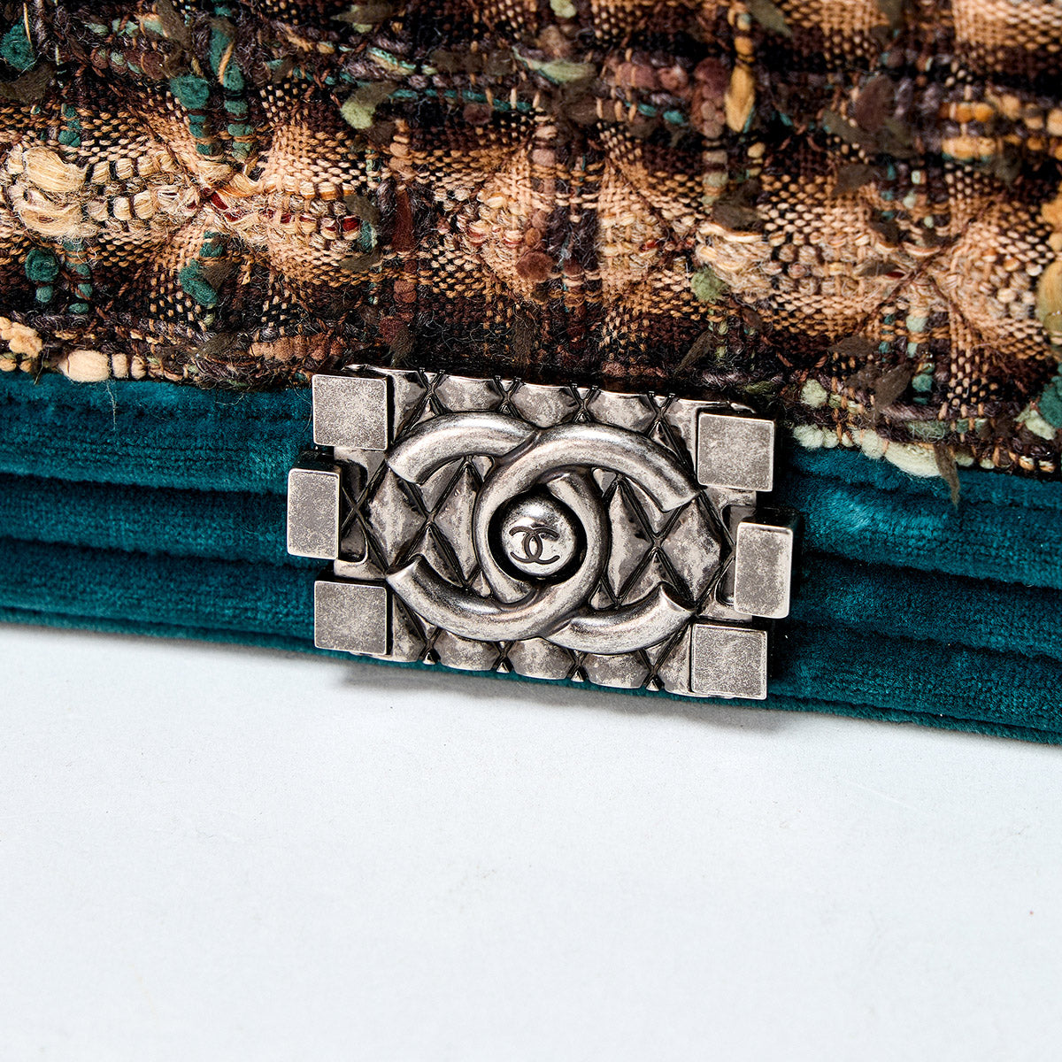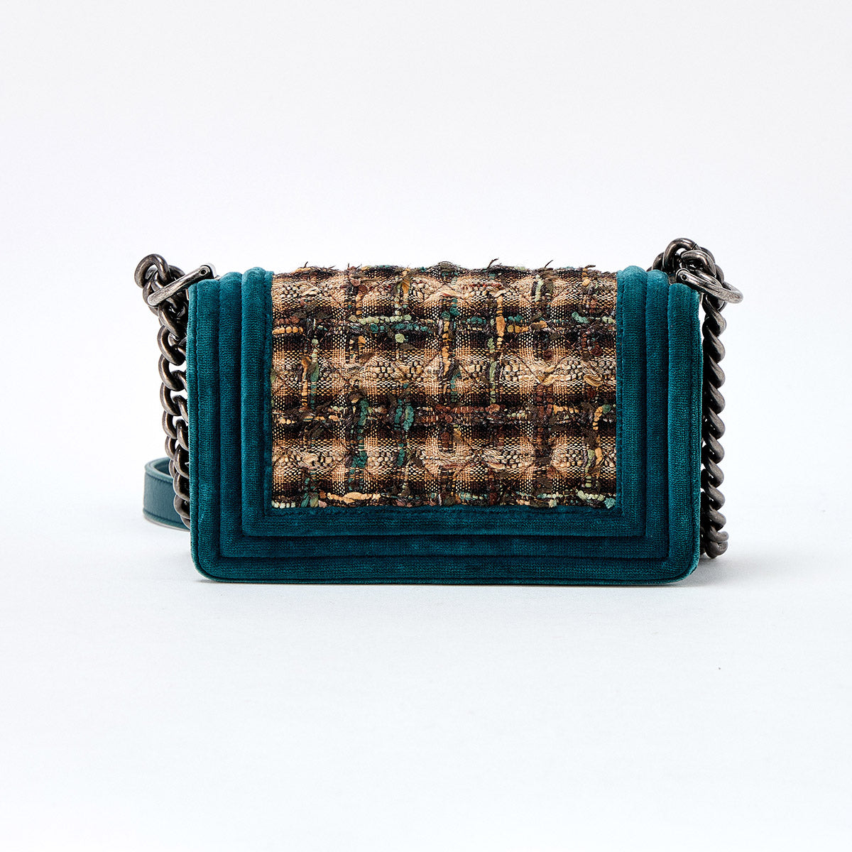 CHANEL Boy Chanel Single Flap Double Chain Small 2014 Shoulder Bag Green Brown Silver Velour Auth
