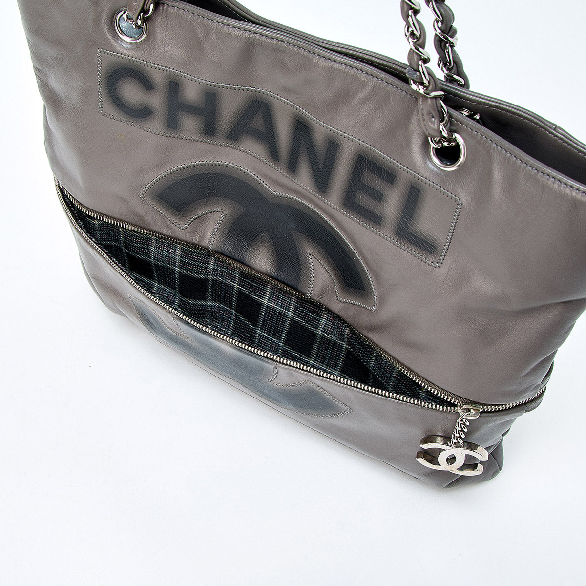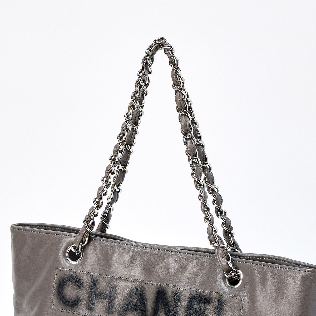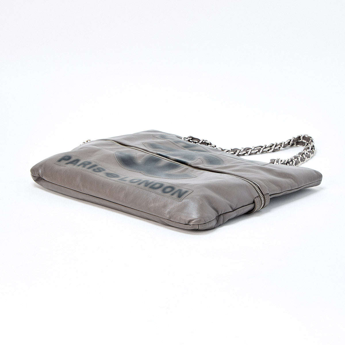CHANEL COCO Mark Paris London Chain Tote 2008 Tote Bag Grey Silver Calf Skin Auth