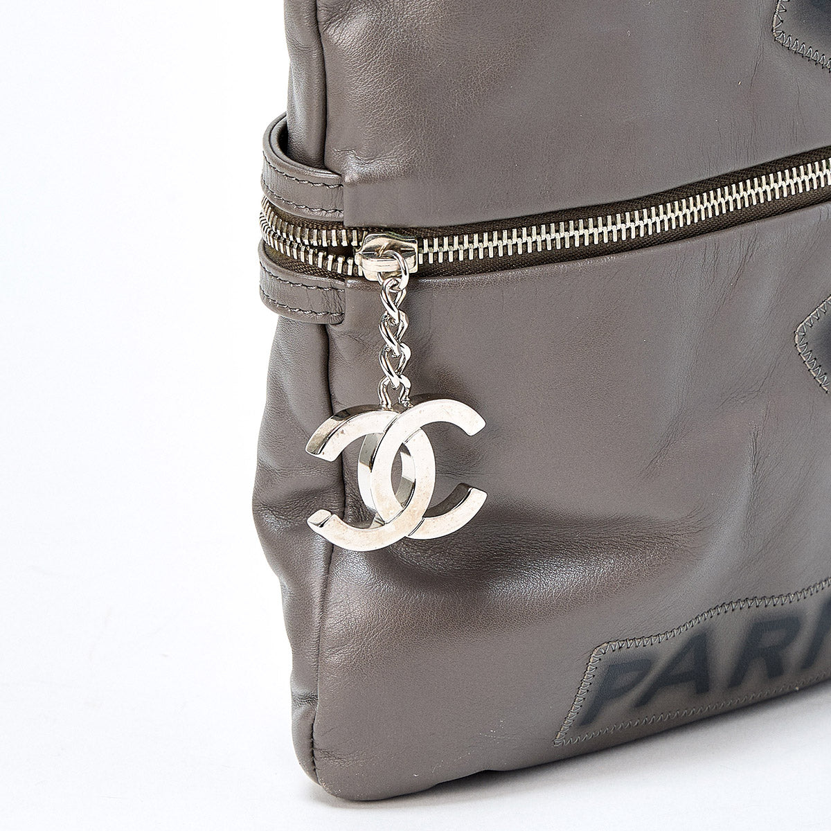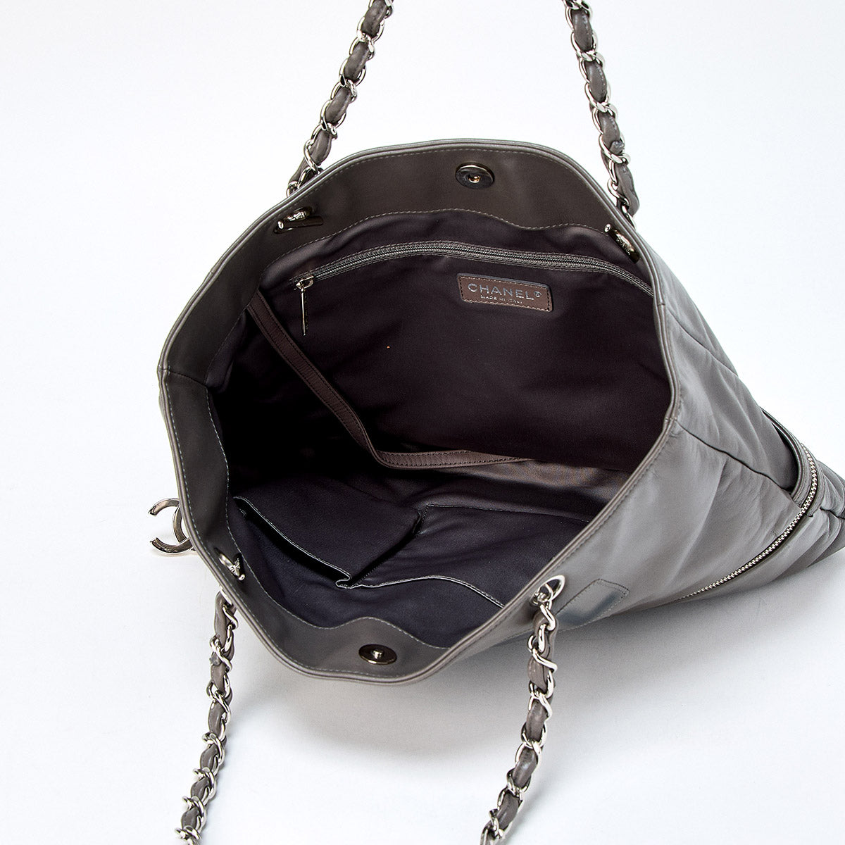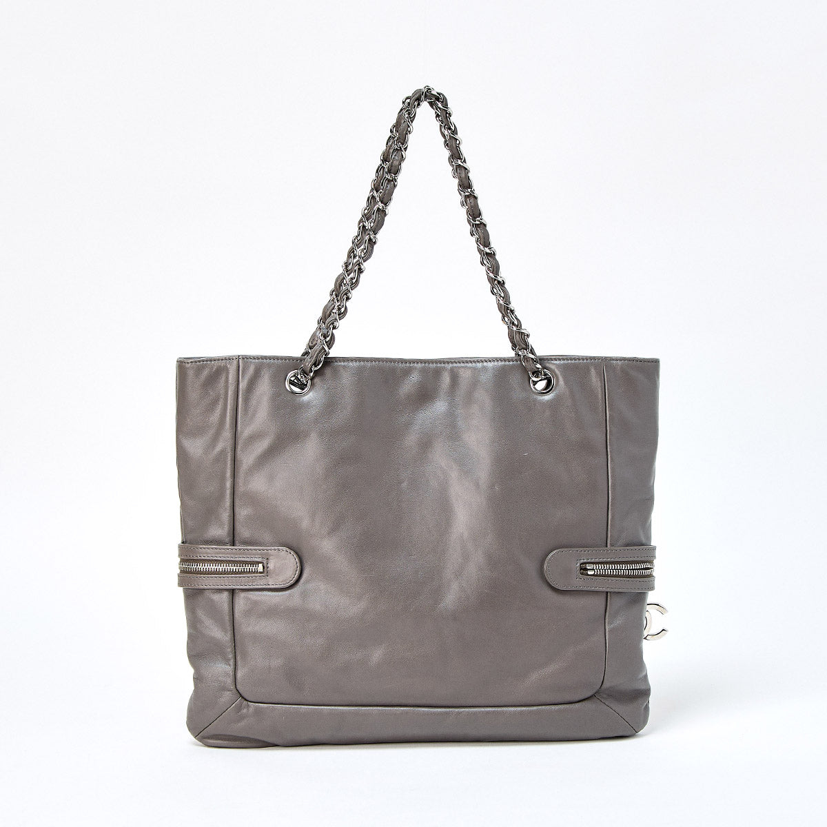 CHANEL COCO Mark Paris London Chain Tote 2008 Tote Bag Grey Silver Calf Skin Auth