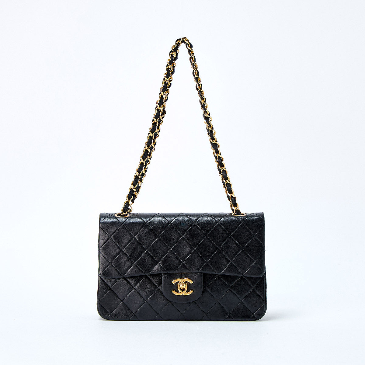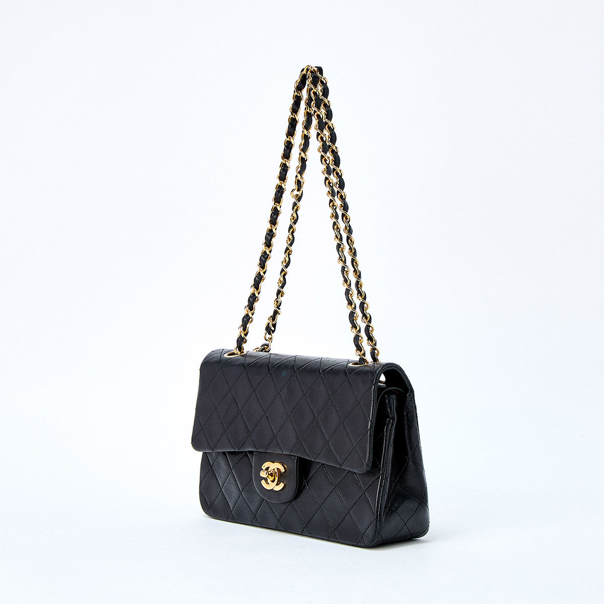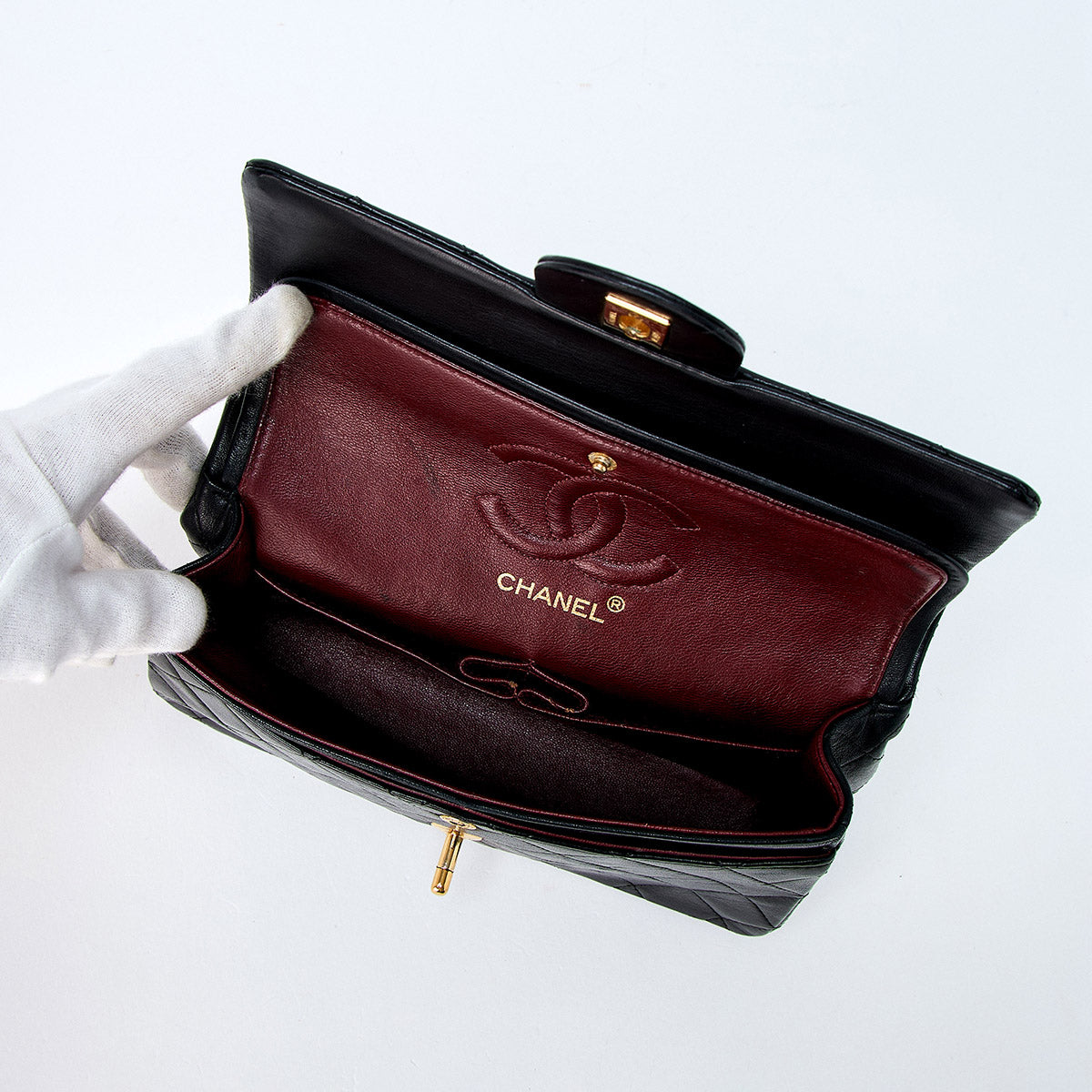 CHANEL Matelasse 23 Double Flap Double Chain Shoulder Bag circa 1990 Black Gold Lamb Skin Auth