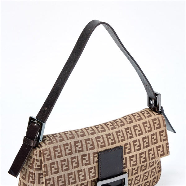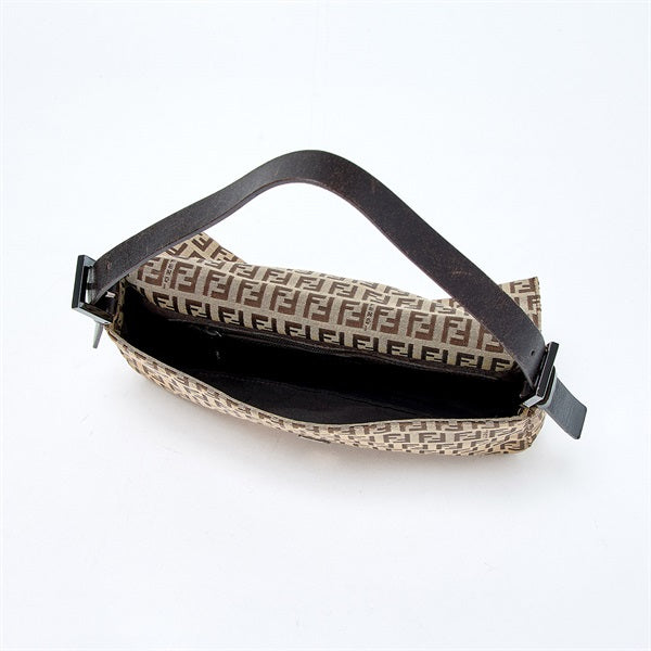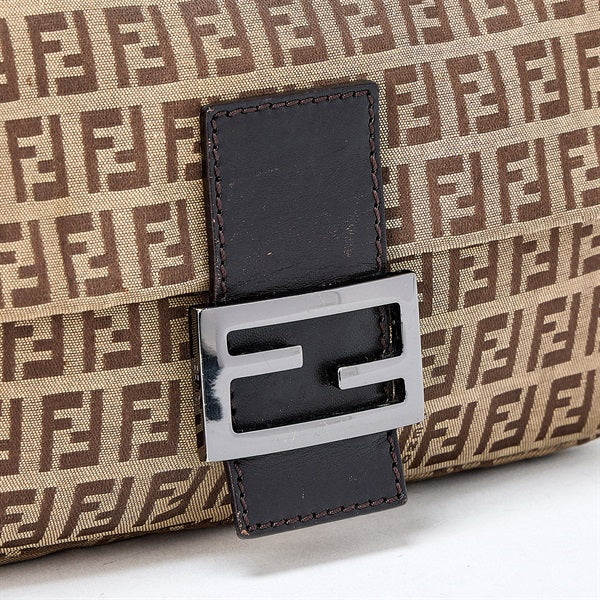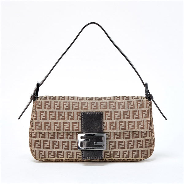 FENDI Mamma Baguette Zucchino Shoulder Bag Beige Matte Silver Canvas Auth
