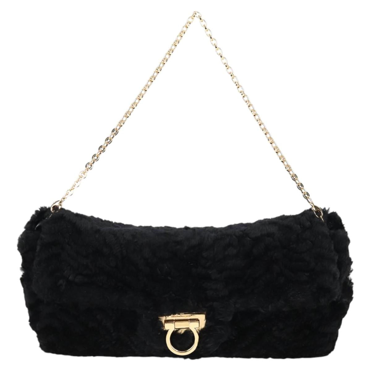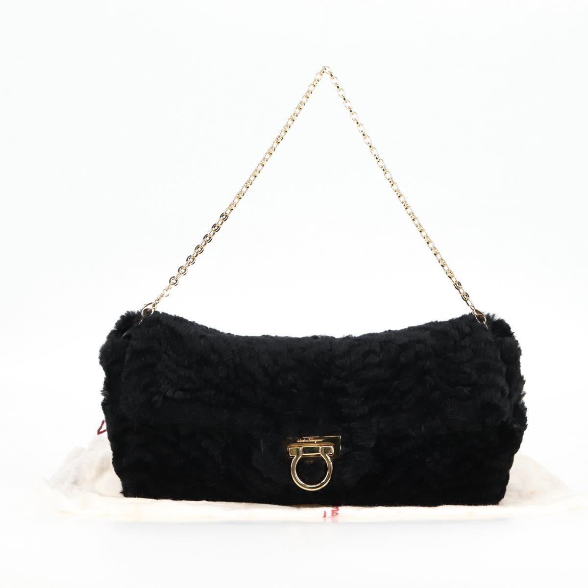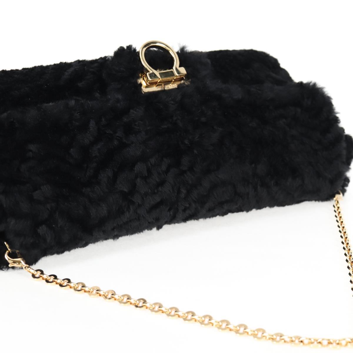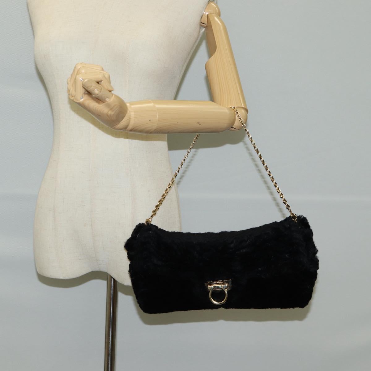 Salvatore Ferragamo Gancini Chain Shoulder Bag Fur Black Gold Auth 124868V