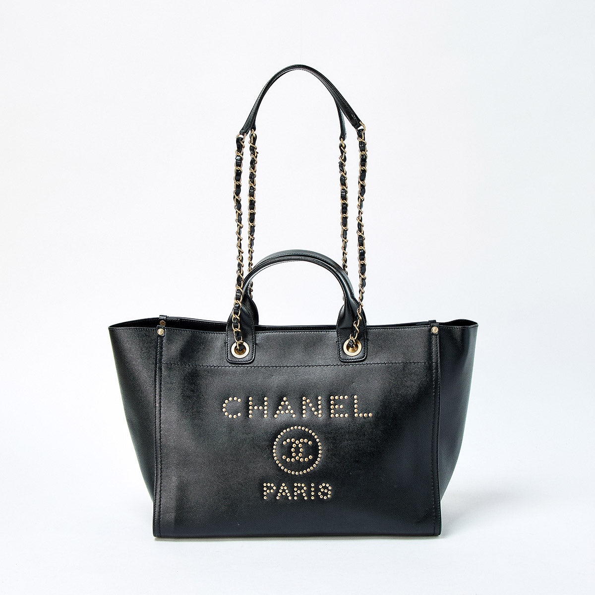 CHANEL Deauville GM 2019 Tote Bag Black Gold Caviar Skin Auth