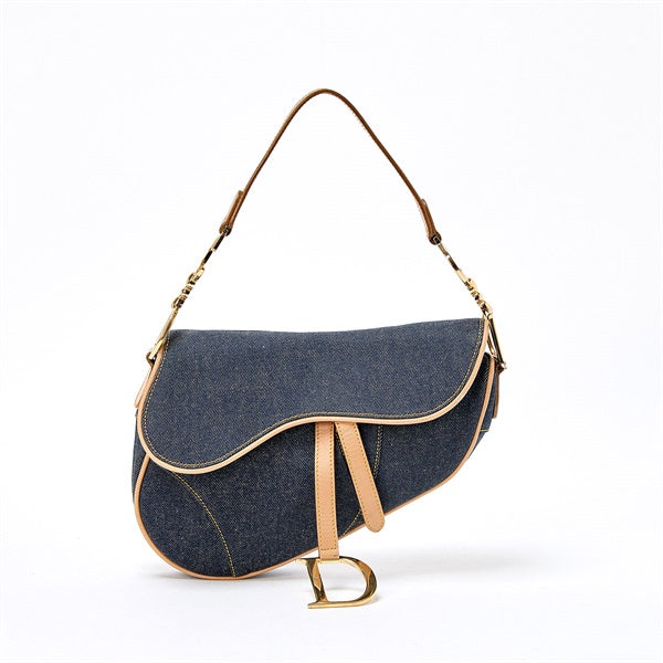 Christian Dior Saddle Shoulder Bag Blue Beige Gold Denim Auth